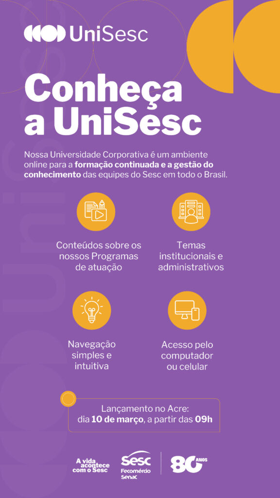 A UniSesc é uma plataforma digital que oferece capacitações online organizadas em academias temáticas: Educação, Saúde, Cultura, Lazer e Assistência, além das áreas de Administração, Liderança e Institucional. O objetivo é universalizar o acesso ao conhecimento institucional e promover o desenvolvimento técnico das equipes, alinhado ao propósito de ampliar a qualidade e a efetividade das ações do Sesc em todo o país.