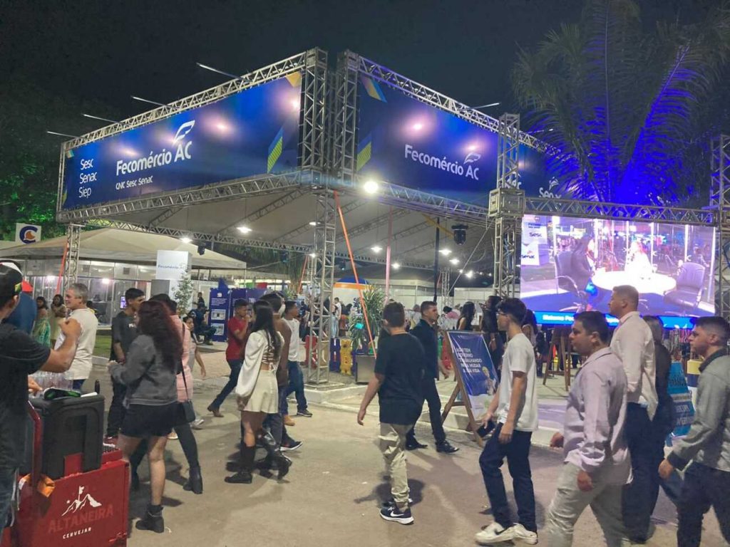 A primeira noite no estande do Sistema Fecomércio-Sesc-Senac/AC na Expoacre 2022 foi um sucesso! Já na estreia, no sábado, 30, a entidade apresentou uma gama de serviços, tais como apresentações culturais, música, espaço infantil – idealizados pelo Sesc no Acre – oficinas, realizadas pelo Senac Acre. No sábado, também, ocorreu a primeira transmissão da Fecomércio-AC,