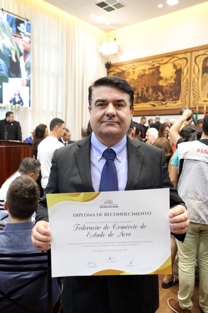 Na manhã desta quarta-feira (4), a Federação do Comércio de Bens, Serviços e Turismo do Estado do Acre (Fecomércio/AC) foi homenageada durante sessão solene na Assembleia Legislativa do Estado do Acre (Aleac) pelos 50 anos da Expoacre, a maior feira de agronegócios do estado. O presidente em exercício da Fecomércio-AC, Leonel Soncin, acompanhado do superintendente da Fecomércio, Luiz Pontes, recebeu a honraria em reconhecimento ao trabalho que o Sistema Fecomércio-Sesc-Senac realiza em prol do desenvolvimento econômico e social do Acre.