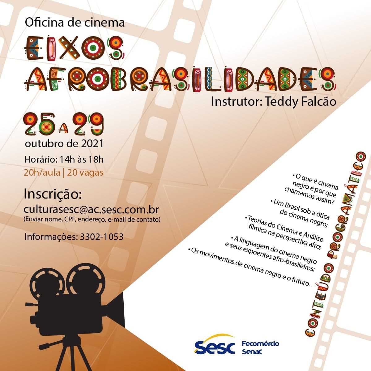 Inscrição: Enviar nome, CPF, endereço, e-mail e contato para o e-mail: culturasesc@ac.sesc.com.br