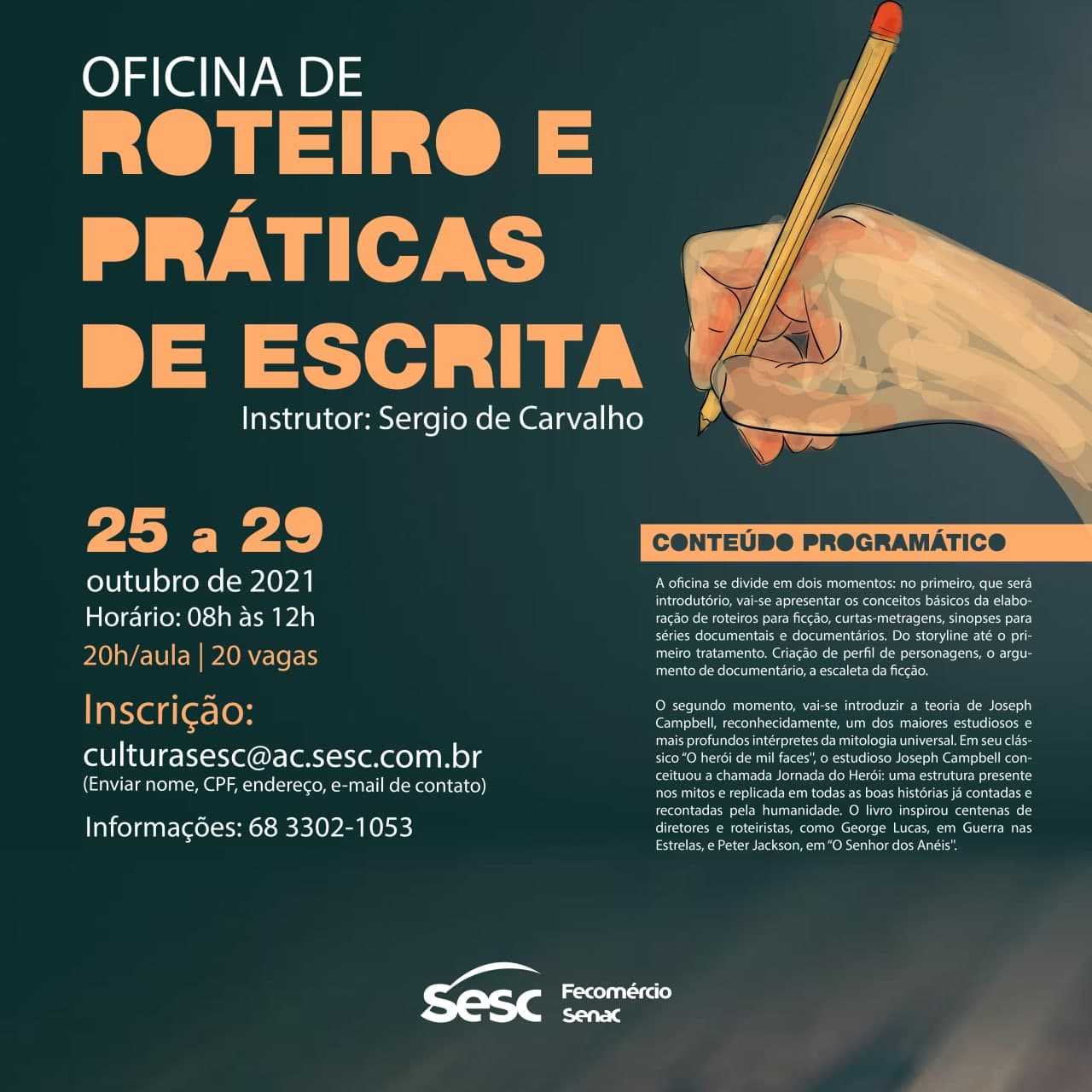 Com foco na produção audiovisual, o Sesc no Acre realizará de 25 a 29 de outubro as oficinas “Roteiro e Práticas de Escrita”, com mediação de Sérgio de Carvalho; e “Eixo Afrobrasilidades”, com o instrutor Teddy Falcão. As inscrições podem ser feitas até 24 de outubro, pelo e-mail culturasesc@ac.sesc.com.br. Podem se inscrever pessoas acima de 16 anos, de forma gratuita.