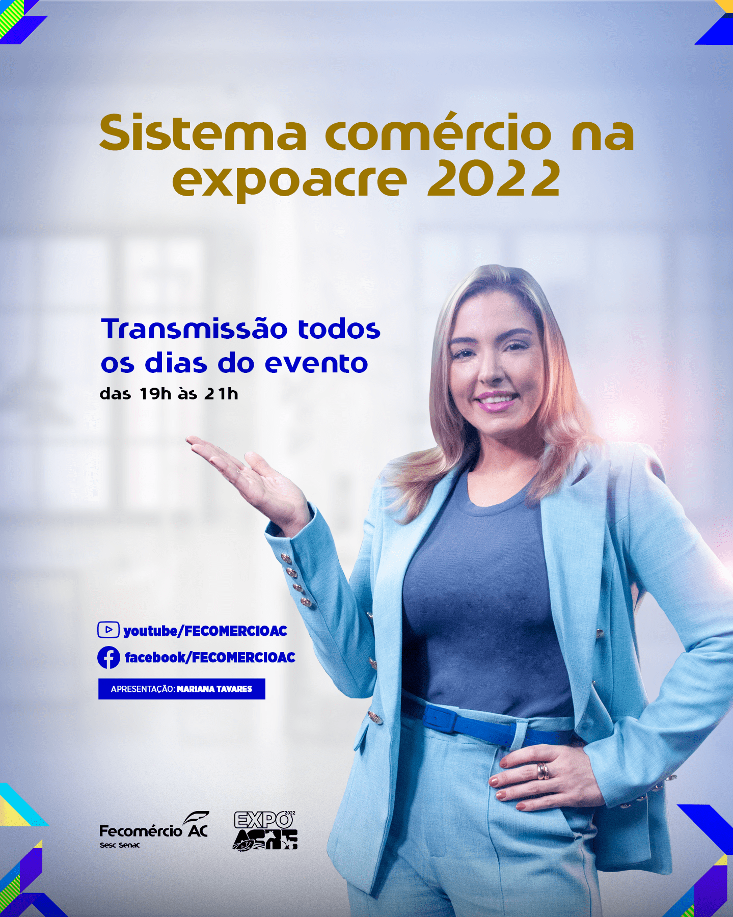 O Sistema Fecomércio-Sesc-Senac/AC estará durante todas as noites da Expoacre 2022 com transmissões ao vivo no canal do Youtube e na página do Facebook da entidade. A apresentação ficará por conta de Mariana Tavares e, ao longo de todo o evento, o Sistema Fecomércio-AC terá apresentações culturais, espaços para as crianças, capacitações e, ainda, testes rápidos e vacinação contra Covid-19, influenza e sarampo.